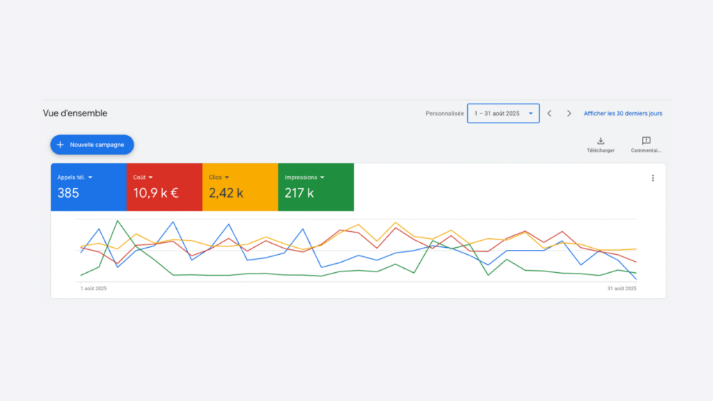 Suivi détaillé de l’efficacité de vos campagnes Google Ads avec des indicateurs clairs qui démontrent l’impact sur votre activité d’artisan.